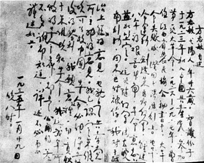 1935年2月底,國(guó)民黨江西省黨部一個(gè)執(zhí)委偕江西《民國(guó)日?qǐng)?bào)》記者來(lái)訪。當(dāng)記者問(wèn)到是否向獄方提出“假以時(shí)間,俾寫自傳”時(shí),方說(shuō)“擬定數(shù)萬(wàn)言,唯以心緒不寧,迄未成就”。