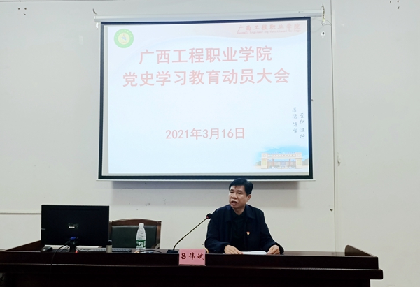 3月16日下午,廣西工程職業(yè)學(xué)院黨委在圖書(shū)館一樓學(xué)術(shù)報(bào)告廳組織全體黨員參加全區(qū)教育系統(tǒng)黨史學(xué)習(xí)教育動(dòng)員視頻會(huì)。校黨委書(shū)記呂偉斌,校長(zhǎng)唐林,校黨委副書(shū)記、副校長(zhǎng)胡細(xì)木,副校長(zhǎng)羅艷妮,校長(zhǎng)助理黃秋霞等校級(jí)黨政領(lǐng)導(dǎo)出席會(huì)議。