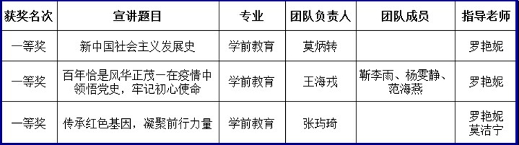 經(jīng)認(rèn)真評(píng)選,最終評(píng)選出一等獎(jiǎng)3名、二等獎(jiǎng)8名、三等獎(jiǎng)20名?!缎轮袊?guó)社會(huì)主義發(fā)展史》、《百年恰是風(fēng)華正茂—在疫情中領(lǐng)悟黨史,牢記初心使命》、《傳承紅色基因,凝聚前行力量》等3個(gè)團(tuán)隊(duì)榮獲一等獎(jiǎng);《新中國(guó)史之中華人民共和國(guó)的成立》、《學(xué)黨史、感黨恩、跟黨走》等5個(gè)參賽團(tuán)隊(duì)榮獲二等獎(jiǎng);《弘揚(yáng)長(zhǎng)征精神,走好新長(zhǎng)征路》、《一葉紅船,百年崢嶸》等20個(gè)團(tuán)隊(duì)榮獲三等獎(jiǎng)。祝賀同學(xué)們?nèi)〉脙?yōu)異成績(jī)。