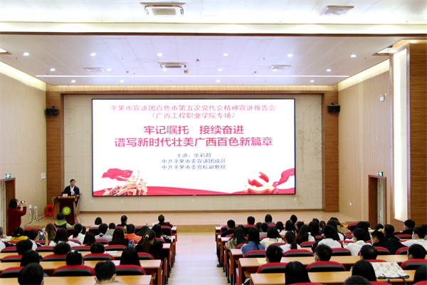 宣講報告會上,張彩超副教授圍繞百色市第五次黨代會概況、深刻認(rèn)識第五次黨代會的背景和重大意義、深入領(lǐng)會百色市五年來八大方面的重大歷史性成就、如何準(zhǔn)確把握今后五年的一系列新任務(wù)和新目標(biāo)以及學(xué)習(xí)貫徹第五次黨代會精神的實踐要求等內(nèi)容作了深刻的闡述。