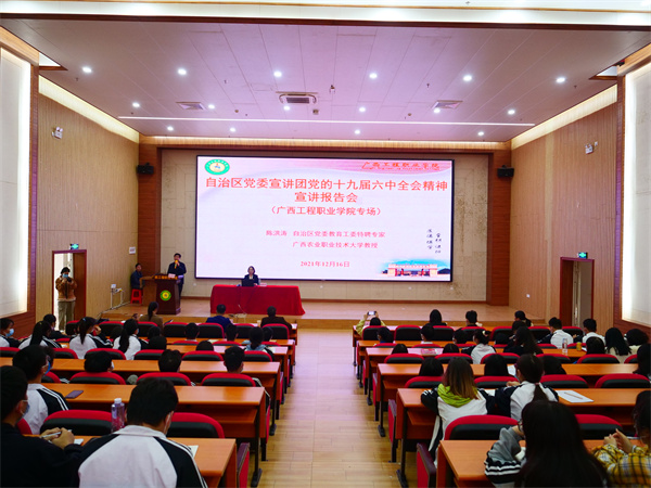 12月16日下午,在學校圖文信息大樓一樓學術報告廳,自治區(qū)黨委教育工委宣講團成員陳洪濤教授作主題為“黨的十九屆六中全會精神”宣講報告。學校黨委書記呂偉斌,黨委委員、副校長彭高彬、副校長吳先夏,校長助理黃秋霞、覃清香等領導,各部門負責人、各黨支部書記、師生黨員、學生代表等400多人參加報告會。報告會由呂偉斌主持。