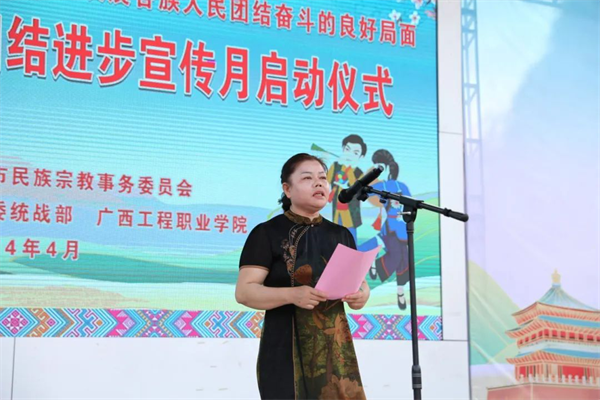黨委副書記、校長(zhǎng)羅艷妮在致辭中向出席啟動(dòng)儀式的各位領(lǐng)導(dǎo)和嘉賓表示歡迎,向關(guān)心支持廣西工程職業(yè)學(xué)院民族團(tuán)結(jié)進(jìn)步事業(yè)的各級(jí)領(lǐng)導(dǎo)、各界人士和積極投身民族團(tuán)結(jié)進(jìn)步事業(yè)創(chuàng)建的廣大干部群眾、師生員工表示感謝。