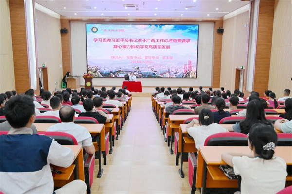 2024年7月9日,學(xué)校黨委在圖文信息大樓一樓學(xué)術(shù)報(bào)告廳舉行學(xué)習(xí)貫徹習(xí)近平總書(shū)記關(guān)于廣西工作論述的重要要求專題宣講會(huì),全體教職員工參加宣講會(huì),黨委書(shū)記、督導(dǎo)專員蒙本曼作專題宣講。