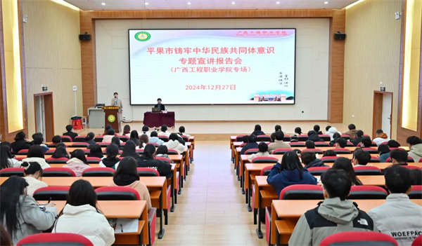 為全面貫徹落實黨的二十屆三中全會精神,深入學習貫徹習近平總書記關(guān)于加強和改進民族工作的重要思想,貫徹落實習近平總書記關(guān)于廣西工作論述的重要要求,增強鑄牢中華民族共同體意識的責任感和使命感,2024年12月27日上午,在圖文信息大樓三樓學術(shù)報告廳,我校舉辦鑄牢中華民族共同體意識專題宣講報告會。學校黨員干部、專任教師、輔導員和學生代表等200多人參加宣講報告會,報告會由黨委辦公室副主任黃香琴主持。
