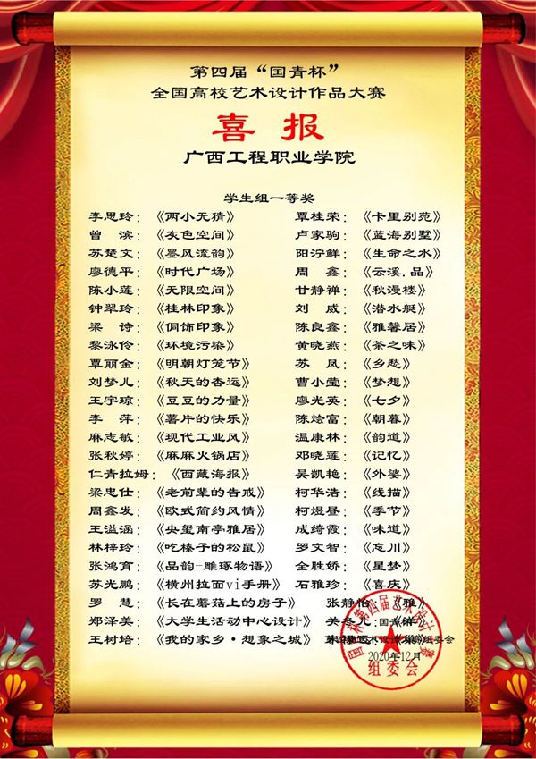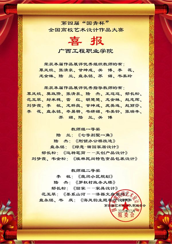 過(guò)去一年,人才培養(yǎng)水平全面提升。新增學(xué)前教育、幼兒發(fā)展與健康管理專業(yè);榮獲第八屆全國(guó)高校數(shù)字藝術(shù)設(shè)計(jì)大賽華南賽區(qū)一等獎(jiǎng)1項(xiàng)、二等獎(jiǎng)7項(xiàng)、三等獎(jiǎng)9項(xiàng),全國(guó)總決賽二等獎(jiǎng)和三等獎(jiǎng)各1項(xiàng);獲第四屆“國(guó)青杯” 全國(guó)高校藝術(shù)設(shè)計(jì)作品大賽學(xué)生組獎(jiǎng)項(xiàng)201項(xiàng),其中一等獎(jiǎng)50項(xiàng)、二等獎(jiǎng)73項(xiàng)、三等獎(jiǎng)78項(xiàng);教師組獲獎(jiǎng)11項(xiàng),其中一等獎(jiǎng)5項(xiàng)、二等獎(jiǎng)6項(xiàng);“學(xué)創(chuàng)杯”2020年全國(guó)大學(xué)生創(chuàng)業(yè)模擬綜合大賽區(qū)級(jí)二等獎(jiǎng)3項(xiàng);獲平果市“互聯(lián)網(wǎng)+”大學(xué)生創(chuàng)新創(chuàng)業(yè)大賽金獎(jiǎng)1項(xiàng),銀獎(jiǎng)2項(xiàng),銅獎(jiǎng)1項(xiàng)。