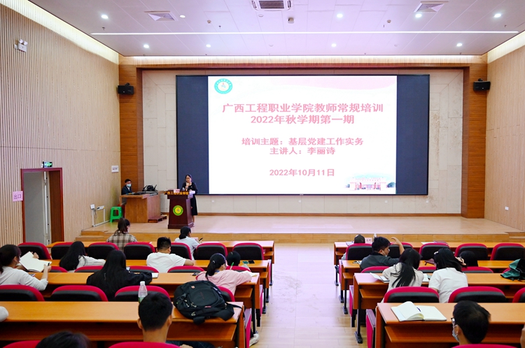 2022年10月11日,廣西工程職業(yè)學(xué)院2022年秋季學(xué)期第一期教師常規(guī)培訓(xùn)在圖文信息大樓一樓報(bào)告廳舉行,學(xué)校黨委委員、學(xué)生工作處副處長(zhǎng)李麗詩(shī)作基層黨建工作實(shí)務(wù)專(zhuān)題培訓(xùn)。