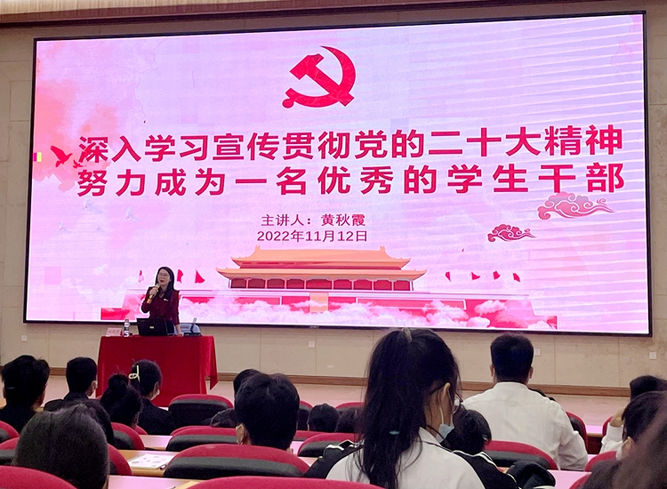 培訓(xùn)會(huì)中,黃秋霞副書記主要圍繞“中共二十大會(huì)議主題”、“黨的二十大重要內(nèi)容解讀”、“貫徹落實(shí)習(xí)總書記的講話”、“如何成為一名優(yōu)秀的學(xué)生干部”等方面,與同學(xué)們一起學(xué)習(xí)了黨的二十大報(bào)告的深刻內(nèi)涵,重溫黨的二十大報(bào)告中對(duì)青年的寄語(yǔ)。并以生動(dòng)鮮活的例子幫助同學(xué)們深化思想認(rèn)識(shí),在學(xué)習(xí)中砥礪初心使命,汲取奮進(jìn)力量。