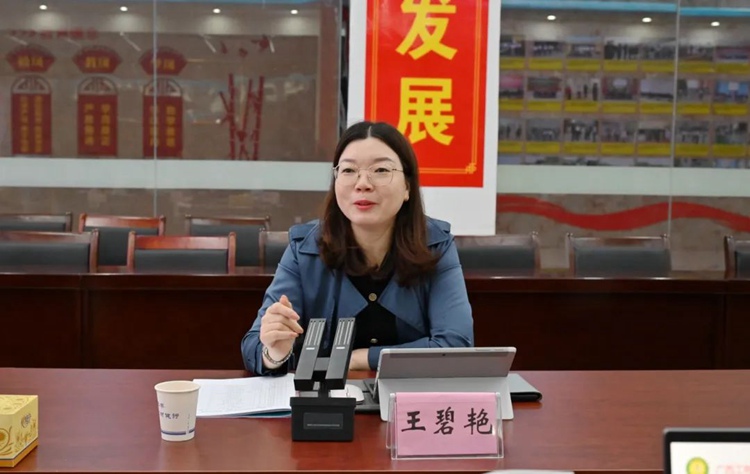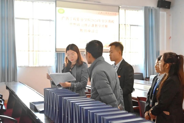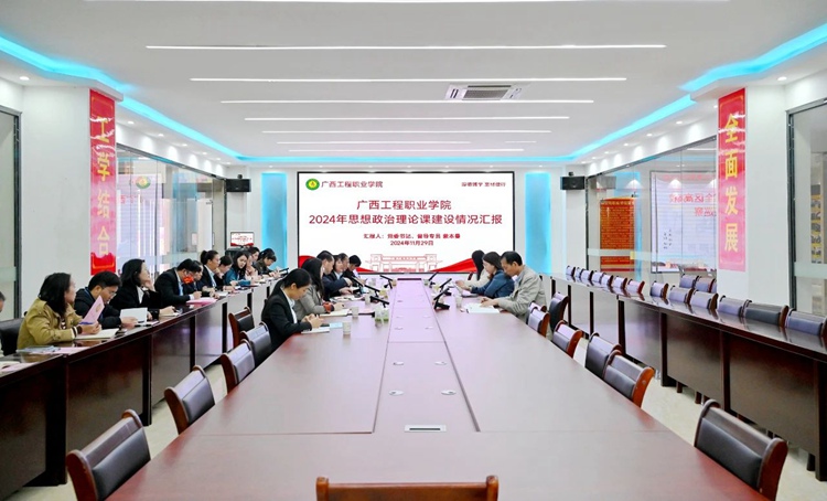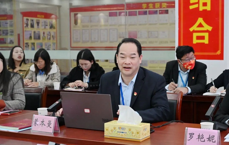 圖為黨委書記、督導(dǎo)專員蒙本曼匯報學(xué)校2024年開展思政理論課建設(shè)工作情況