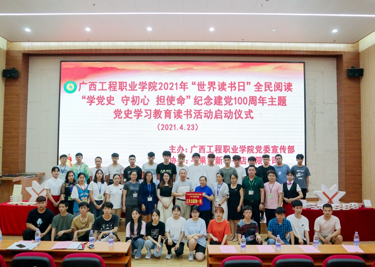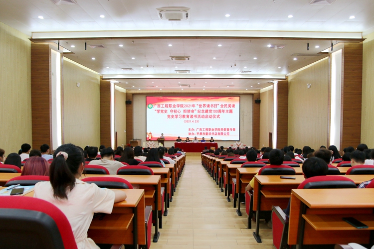 為慶祝中國共產(chǎn)黨成立100周年,創(chuàng)新黨史學(xué)習(xí)教育形式,持續(xù)做好中華優(yōu)秀文化傳承,推動全民閱讀深入大學(xué)校園,在青年學(xué)生中形成“愛讀書、讀好書、善讀書”的風(fēng)尚,營造書香校園氛圍,引導(dǎo)青年學(xué)生傳承紅色基因、牢記初心使命,“學(xué)史明理、學(xué)史增信、學(xué)史崇德、學(xué)史力行”, 4月23日,學(xué)校在圖文信息大樓報告廳舉行廣西工程職業(yè)學(xué)院2021年“世界讀書日”全民閱讀暨“學(xué)黨史 守初心 擔(dān)使命”紀(jì)念建黨100周年主題黨史學(xué)習(xí)教育讀書活動啟動儀式。
