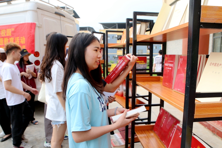 啟動儀式結(jié)束,平果市新華書店有限公司還在圖文信息大樓前展出紅色讀物,吸引了眾多老師和同學(xué)前來參觀。