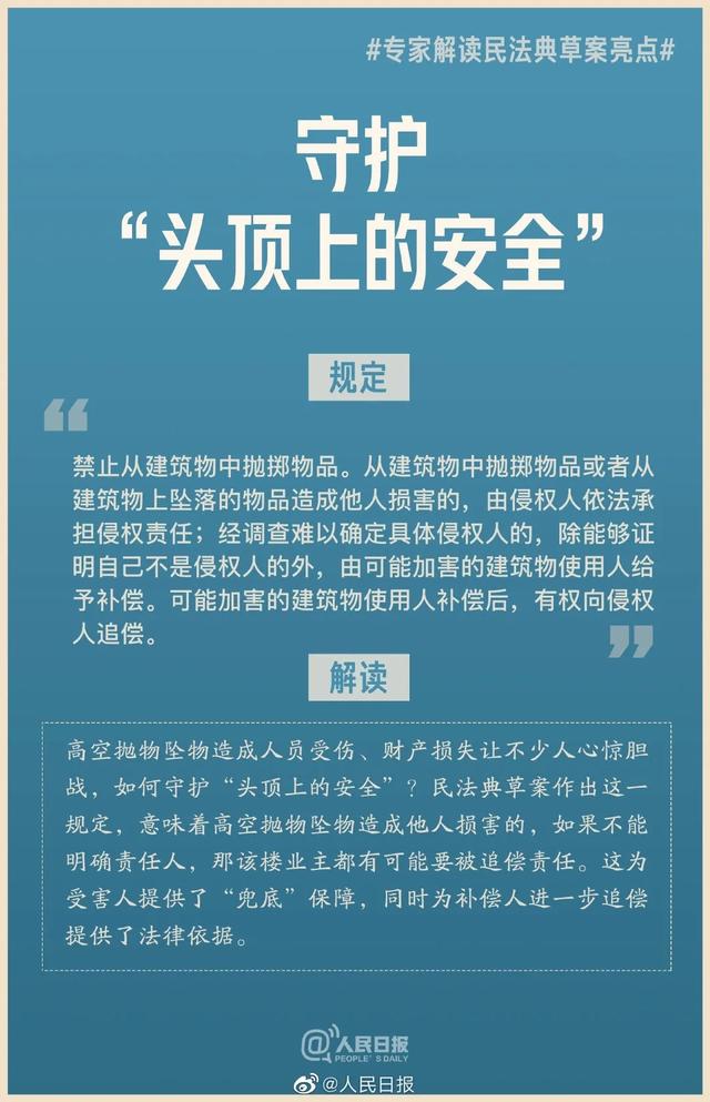 解讀:高空拋物墜物造成人員受傷、財產(chǎn)損失讓不少人心驚膽戰(zhàn),如何守護(hù)“頭頂上的安全”?民法典草案作出這一規(guī)定,意味著高空拋物墜物造成他人損害的,如果不能明確責(zé)任人,那該樓業(yè)主都有可能要被追償責(zé)任。這為受害人提供了“兜底”保障,同時為補(bǔ)償人進(jìn)一步追償提供了法律依據(jù)。
