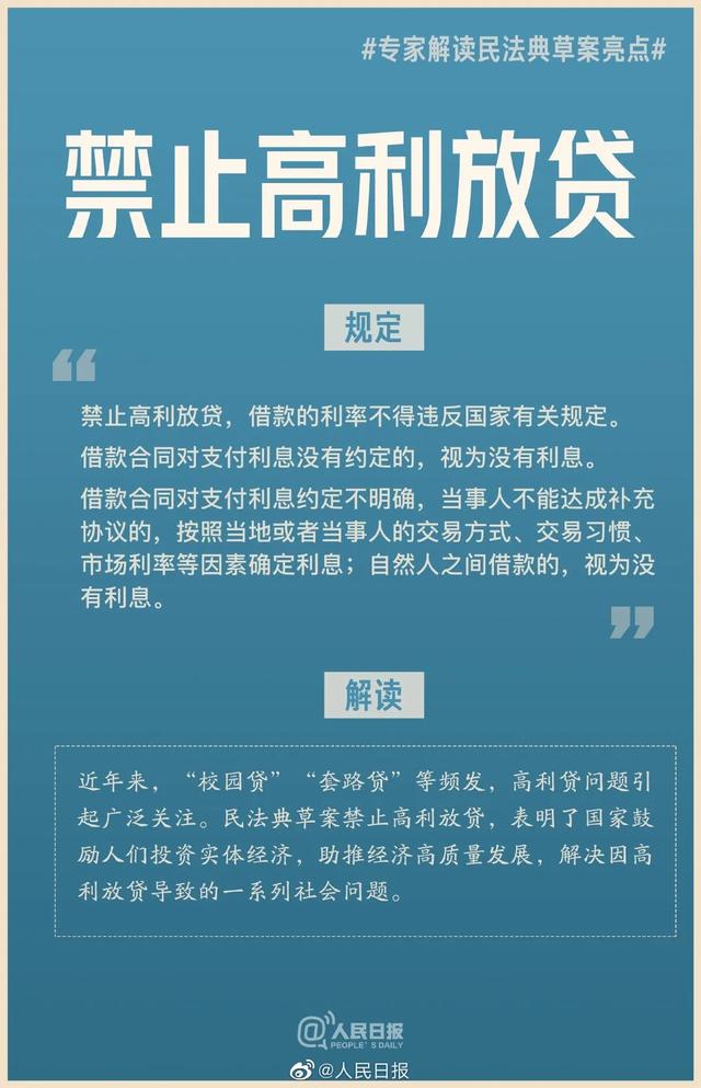 解讀:近年來,“校園貸”“套路貸”等頻發(fā),高利貸問題引起廣泛關(guān)注。民法典草案禁止高利放貸,表明了國家鼓勵人們投資實(shí)體經(jīng)濟(jì),助推經(jīng)濟(jì)高質(zhì)量發(fā)展,解決因高利放貸導(dǎo)致的一系列社會問題。