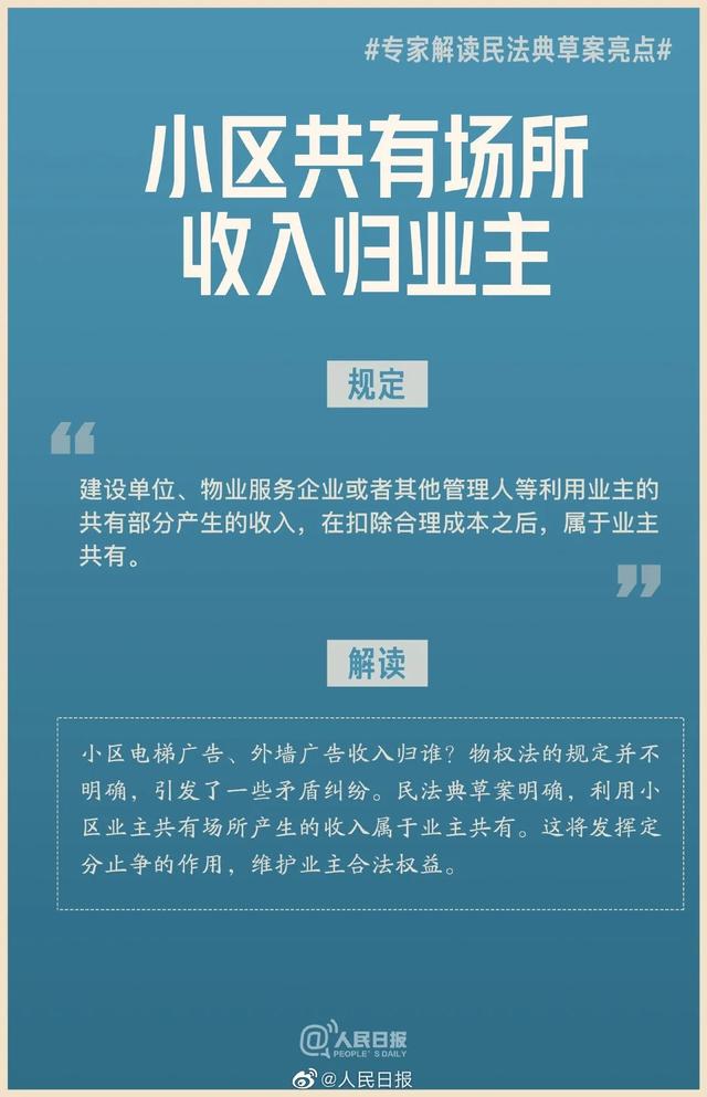 解讀:小區(qū)電梯廣告、外墻廣告收入歸誰?物權(quán)法的規(guī)定并不明確,引發(fā)了一些矛盾糾紛。民法典草案明確,利用小區(qū)業(yè)主共有場所產(chǎn)生的收入屬于業(yè)主共有。這將發(fā)揮定分止?fàn)幍淖饔?,維護(hù)業(yè)主合法權(quán)益。