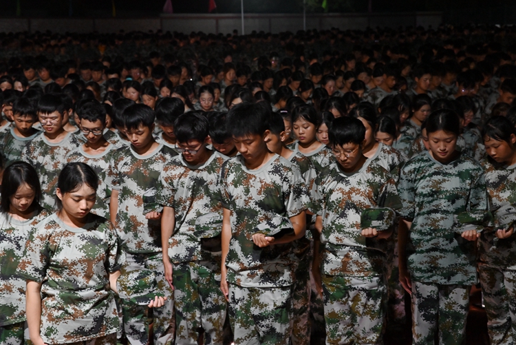 晚上20時,軍訓(xùn)新生集結(jié)學(xué)校田徑運動場,面向鮮艷的五星紅旗莊嚴宣誓:勿忘國恥、吾輩自強,以史為鑒、珍愛和平。字字深入人心,感人肺腑。進一步激發(fā)了同學(xué)們自覺踐行社會主義核心價值觀,培養(yǎng)高尚品德,樹立遠大理想,勤奮學(xué)習(xí),努力成長為祖國建設(shè)的有用之材。宣誓完畢,全體師生進行了默哀。