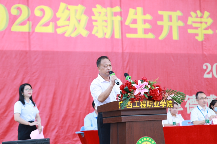 紀委書記、副校長彭高彬帶領(lǐng)全體新生進行入學宣誓。全體新生以青春之名,宣誓表決心:我是廣西工程職業(yè)學院的學生,我將胸懷祖國,遵紀守法,嚴守校紀校規(guī),尊師愛校,勤奮好學,團結(jié)友愛;明德修身,誠以待人,毅以處事;謹記“厚德博學,至材健行”校訓,弘揚“熔煉工匠精神,鑄就一流技藝”的學校精神,緊跟時代步伐,勇?lián)鷼v史使命,立志成才,報效祖國。他們以鏗鏘有力的誓言奏響新時代青年的自強不息、學習向未來的最強音。