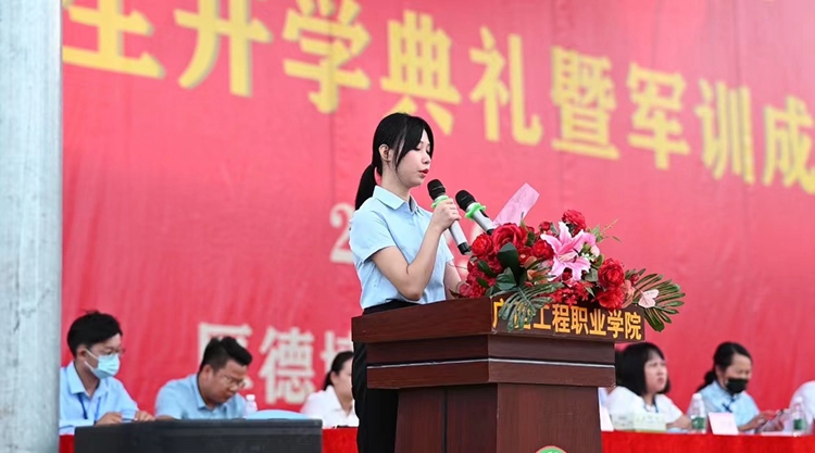 新生代表2022級教育學院學前專業(yè)胡珂馨同學發(fā)言,她表示會把軍訓期間養(yǎng)成的良好品德和作風帶到今后的學習、工作中去,勤奮學習,遵紀守信,自強不息,做一名優(yōu)秀的工程學子。