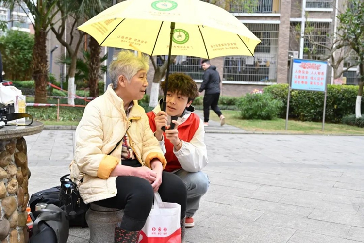 社區(qū)的老人們?cè)谥驹刚叩臄v扶下,緩緩走向拍攝區(qū)域,即將留下這美好的瞬間。