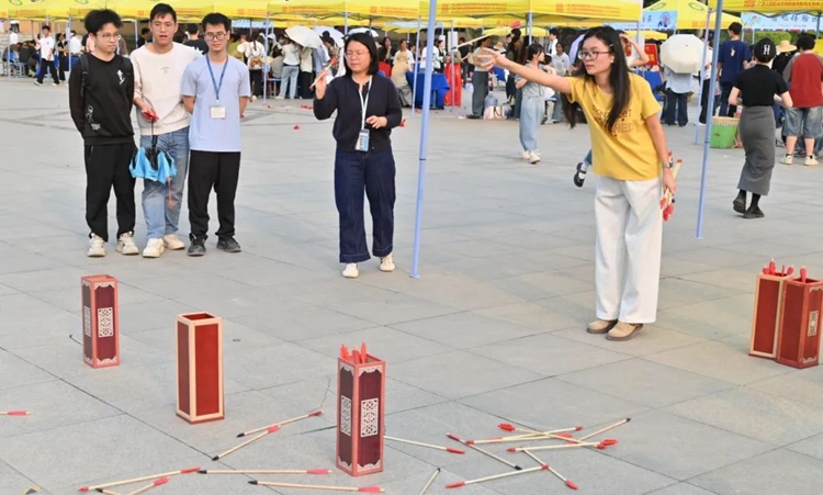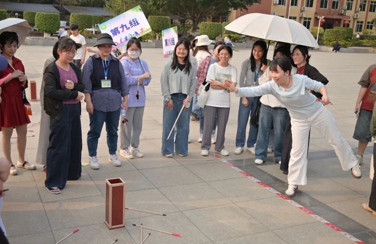 在投壺區(qū)域,則彌漫著一股文雅的氣息。老師們站在指定位置,將箭輕輕投入壺中。每一次投箭,都仿佛穿越時(shí)空,讓人感受到古代文人雅士的閑情逸致。