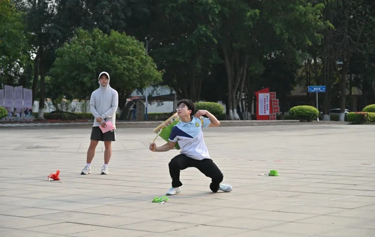 參賽的同學(xué)們默契十足,一人背著背簍靈活移動(dòng),另一人站在指定距離外精準(zhǔn)投球,小小的球在空中劃過(guò)一道道優(yōu)美的弧線(xiàn),每一次成功接球都凝聚著搭檔間的信任與協(xié)作。