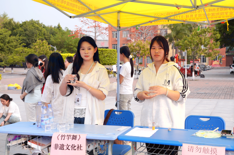 游戲規(guī)則:非遺文化社竹竿舞由工作人員拿竿調(diào)節(jié)竹竿的開(kāi)合節(jié)奏,參與者需手端著裝著一杯水,按照竹竿的節(jié)奏進(jìn)行跳動(dòng)。在跳動(dòng)過(guò)程中,需保證雙腳不被竹竿夾到,同時(shí)杯中的水灑出量不得超過(guò)20%,成功完成一次完整規(guī)范的跳躍即可集章。若被夾腳或水杯中的水灑出20%,則需從頭開(kāi)始,直至順利跳過(guò)。