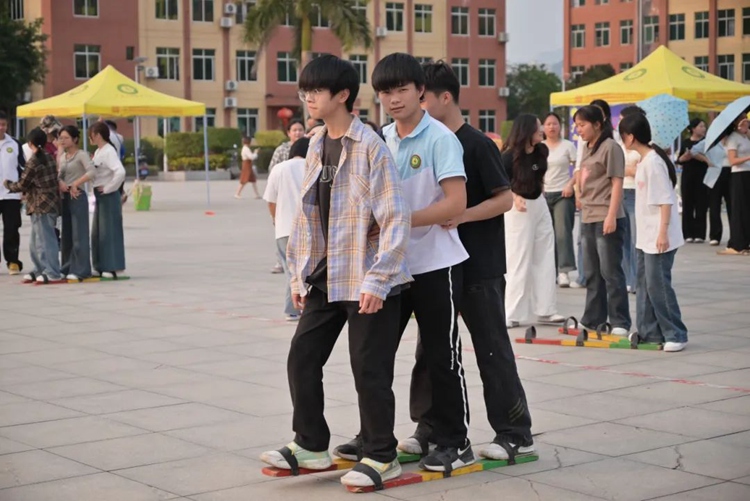 同學(xué)們?nèi)藶橐唤M,共同穿著一塊特制的木板鞋,腳綁定、手扶腰,齊心協(xié)力向前邁進(jìn),他們像靈動(dòng)的蛟龍,步伐整齊地向前沖。