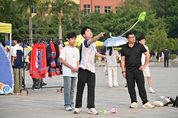 五彩斑斕的繡球在空中飛舞,同學(xué)們高高躍起,瞄準(zhǔn)高桿上的目標(biāo)奮力拋出,繡球準(zhǔn)確穿過(guò)圓環(huán)的瞬間,喝彩聲聲,加油不斷。