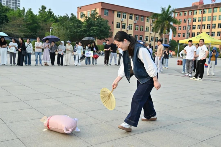 隨著一聲哨響,教師組“趕豬入籠”比賽正式開(kāi)始。老師們手持扇子,各顯神通。有的老師經(jīng)驗(yàn)豐富,扇子運(yùn)用得恰到好處,“小豬”在他們的引導(dǎo)下快速地向終點(diǎn)奔去。