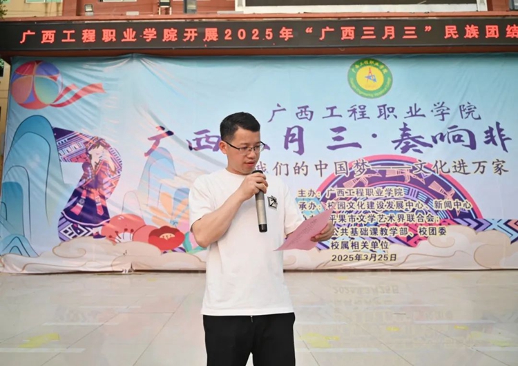 圖為公共基礎(chǔ)課教學(xué)部科長(zhǎng)吳發(fā)德宣布2025年“廣西三月三·奏響非遺韻”民族體育競(jìng)技活動(dòng)獲獎(jiǎng)名單