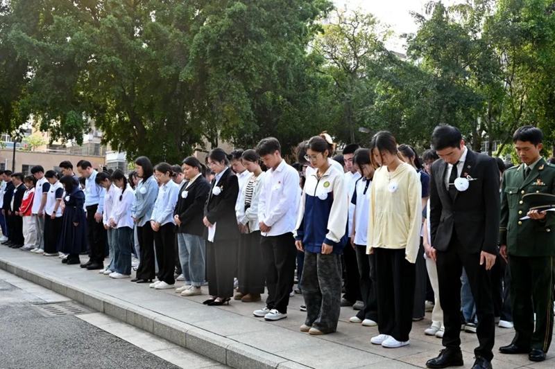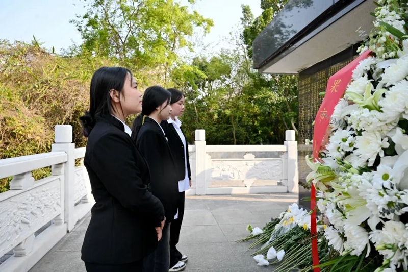 圖為全體師生依次走上瞻仰臺,向革命先烈敬獻(xiàn)小白花