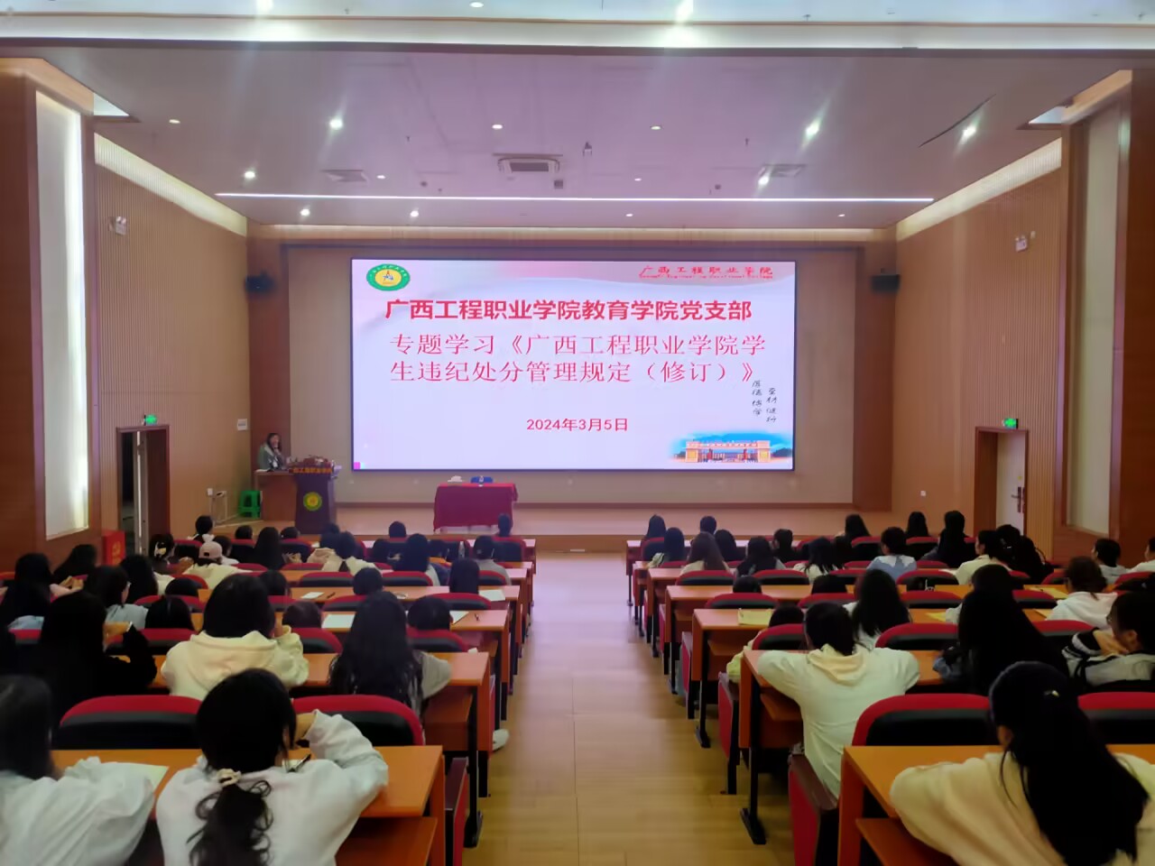 會(huì)上,盧燕梅副書記對《廣西工程職業(yè)學(xué)院學(xué)生違紀(jì)處分管理規(guī)定(修訂)》進(jìn)行深度解讀,強(qiáng)調(diào)了遵守校規(guī)校紀(jì)的重要性,要求同學(xué)們認(rèn)真學(xué)習(xí)相關(guān)制度規(guī)定,自覺遵守校紀(jì)校規(guī),做一名遵紀(jì)守法的大學(xué)生。