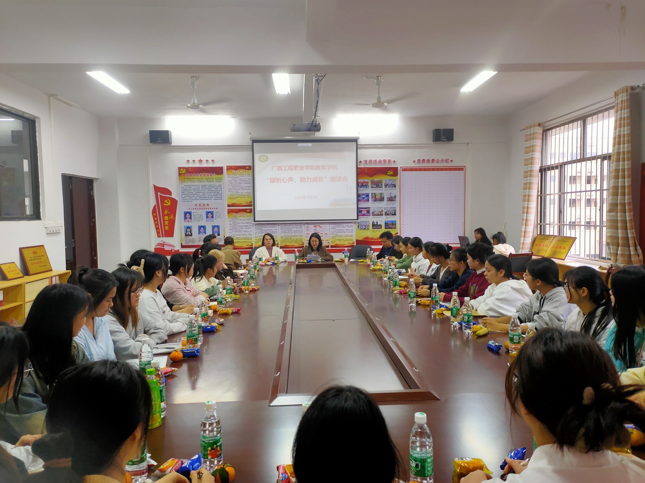為了全面了解和掌握大學(xué)生近期在學(xué)習(xí)、生活中遇到的問題以及訴求,傾聽學(xué)生心聲,回應(yīng)并解決學(xué)生急難愁盼的問題,深入了解學(xué)生需求,共同促進(jìn)學(xué)生全面發(fā)展。教育學(xué)院黨支部于2024年3月7日在教育學(xué)院黨員活動(dòng)室601開展“傾聽心聲,助力成長(zhǎng)”主題座談會(huì)。 參加座談會(huì)的有教育學(xué)院黨支部書記、院長(zhǎng)梁鳳琴、教育學(xué)院黨支部副書記盧燕梅、教育學(xué)院黨支部組織委員兼紀(jì)律委員葉健芳、教育學(xué)院黨支部宣傳委員吳巧梅、教育學(xué)院黨支部統(tǒng)戰(zhàn)委員王冬、教育學(xué)院辦公室主任農(nóng)淑娟、教育學(xué)院教研室副主任馬熙、教育學(xué)院學(xué)生代表30人