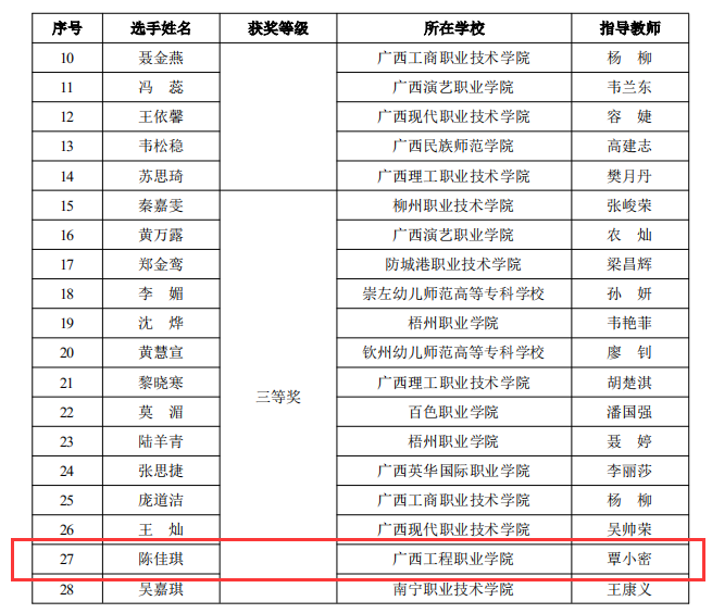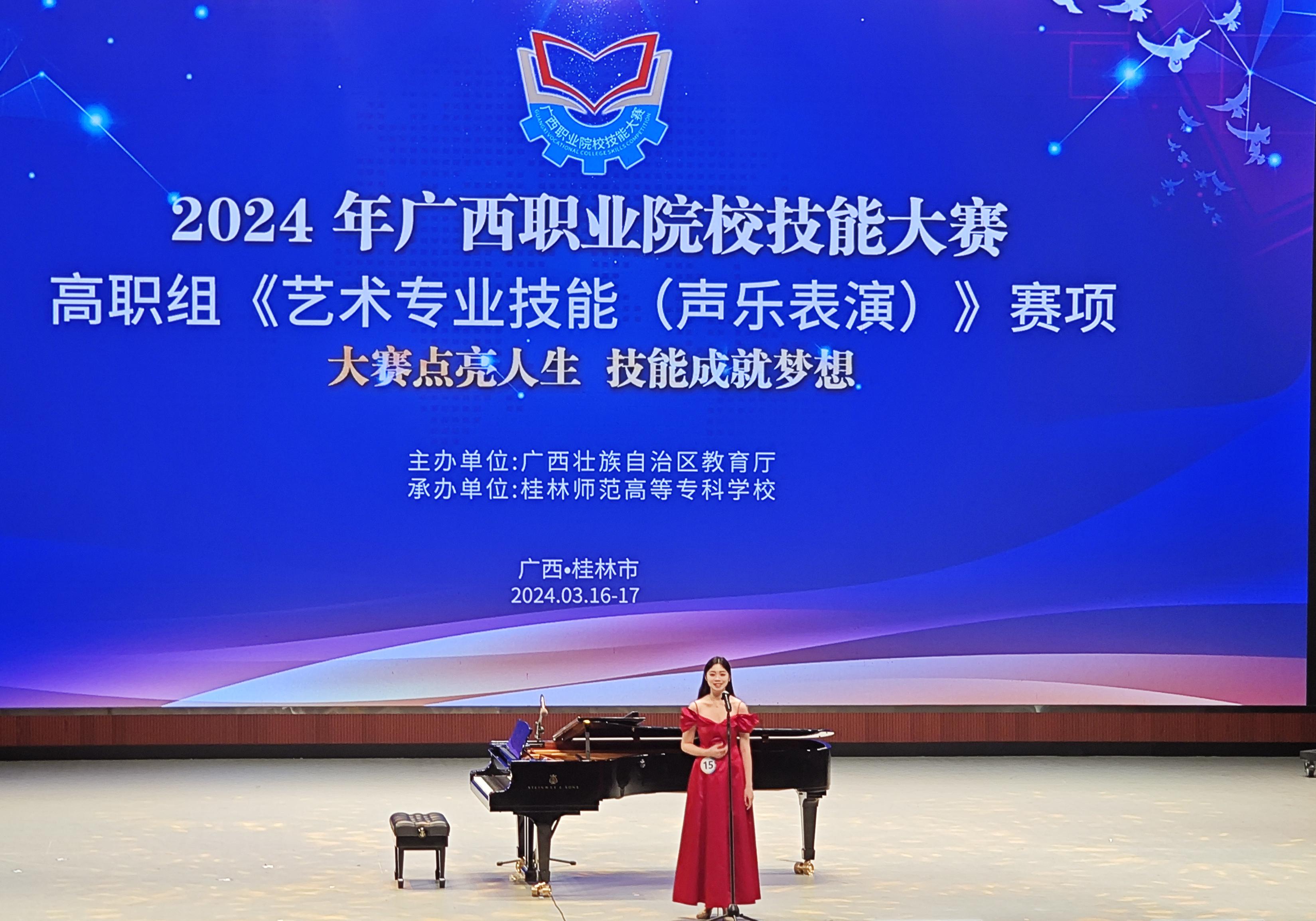為積極響應(yīng)自治區(qū)教育廳組織開展的2024年廣西職業(yè)院校技能大賽。我院教師覃小密指導(dǎo)學(xué)生參加的高職組《藝術(shù)專業(yè)技能(聲樂表演)》賽項中榮獲個人三等獎。