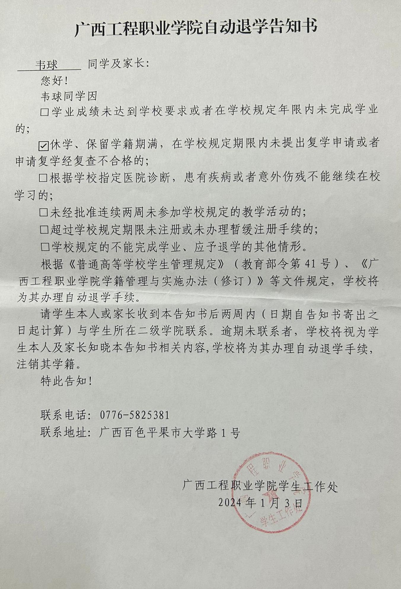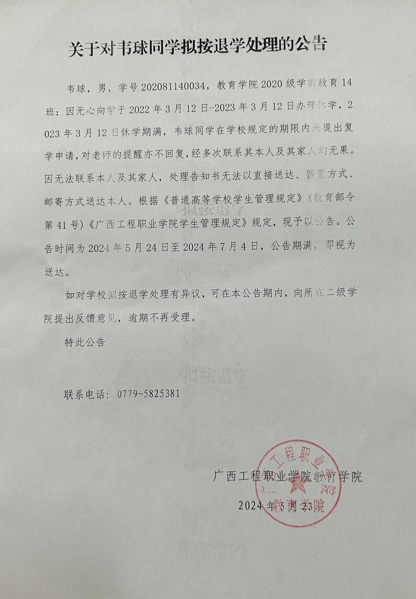 關(guān)于對韋球同學(xué)擬按退學(xué)處理的公告