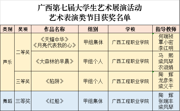 近日,根據(jù)廣西壯族自治區(qū)教育廳下發(fā)的《自治區(qū)教育廳關(guān)于公布廣西第七屆大學(xué)生藝術(shù)展演活動獲獎名單的通知》(桂教體衛(wèi)藝〔2024〕6號)文件,我院教師參與指導(dǎo)的作品在廣西第七屆大學(xué)生藝術(shù)展活動表現(xiàn)出色,榮獲二等獎2項,三等獎2項。