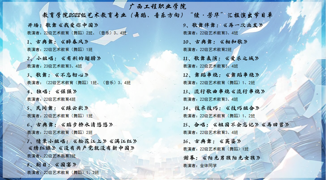 隨著校長助理梁善雅宣布教育學(xué)院2022級藝術(shù)教育專業(yè)(舞蹈、音樂方向)“續(xù)·芳華”匯報演出正式開始,精彩的匯報演出拉開了帷幕。本次匯報演出主要以舞蹈、歌唱、舞臺劇、情景劇等表演形式呈現(xiàn),多角度展示了藝術(shù)專業(yè)同學(xué)們的學(xué)習(xí)成果,展現(xiàn)廣大學(xué)子積極向上的精神風(fēng)貌。