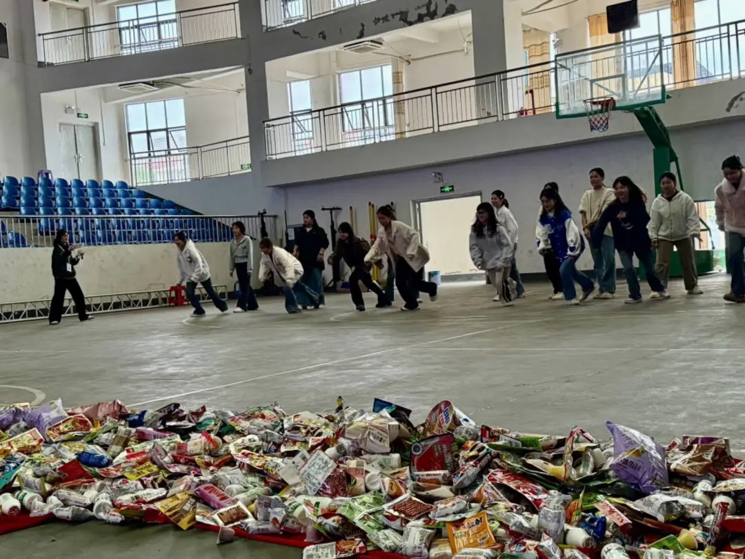 “接力套圈”游戲,每個(gè)班派10個(gè)人組成一隊(duì)人,兩位選手在起點(diǎn)面對(duì)面用自體撐著套圈走到終點(diǎn)從終點(diǎn)以過山洞的方式回到起點(diǎn)、用時(shí)最短的前七名獲得零食大禮包。