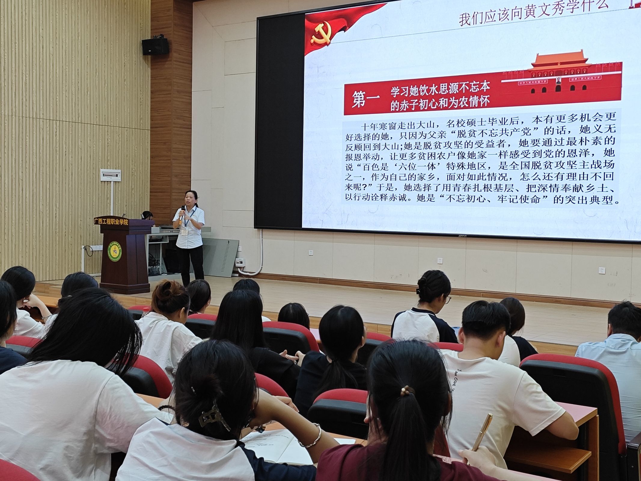 龐英連從四個方面進(jìn)行授課:一是學(xué)習(xí)黃文秀的精神內(nèi)涵;二是我們應(yīng)該向黃文秀學(xué)什么;三是學(xué)習(xí)黃文秀做新時代的好榜樣;四是學(xué)習(xí)黃文秀精神,做新時代有為青年。她強(qiáng)調(diào),我們要學(xué)習(xí)黃文秀同志飲水思源不忘本的赤子初心和為農(nóng)情懷;學(xué)習(xí)她不讓一個困難群眾掉隊的堅實信念和堅定信仰;學(xué)習(xí)她不獲全勝不撤退的使命擔(dān)當(dāng)和扶貧精神。