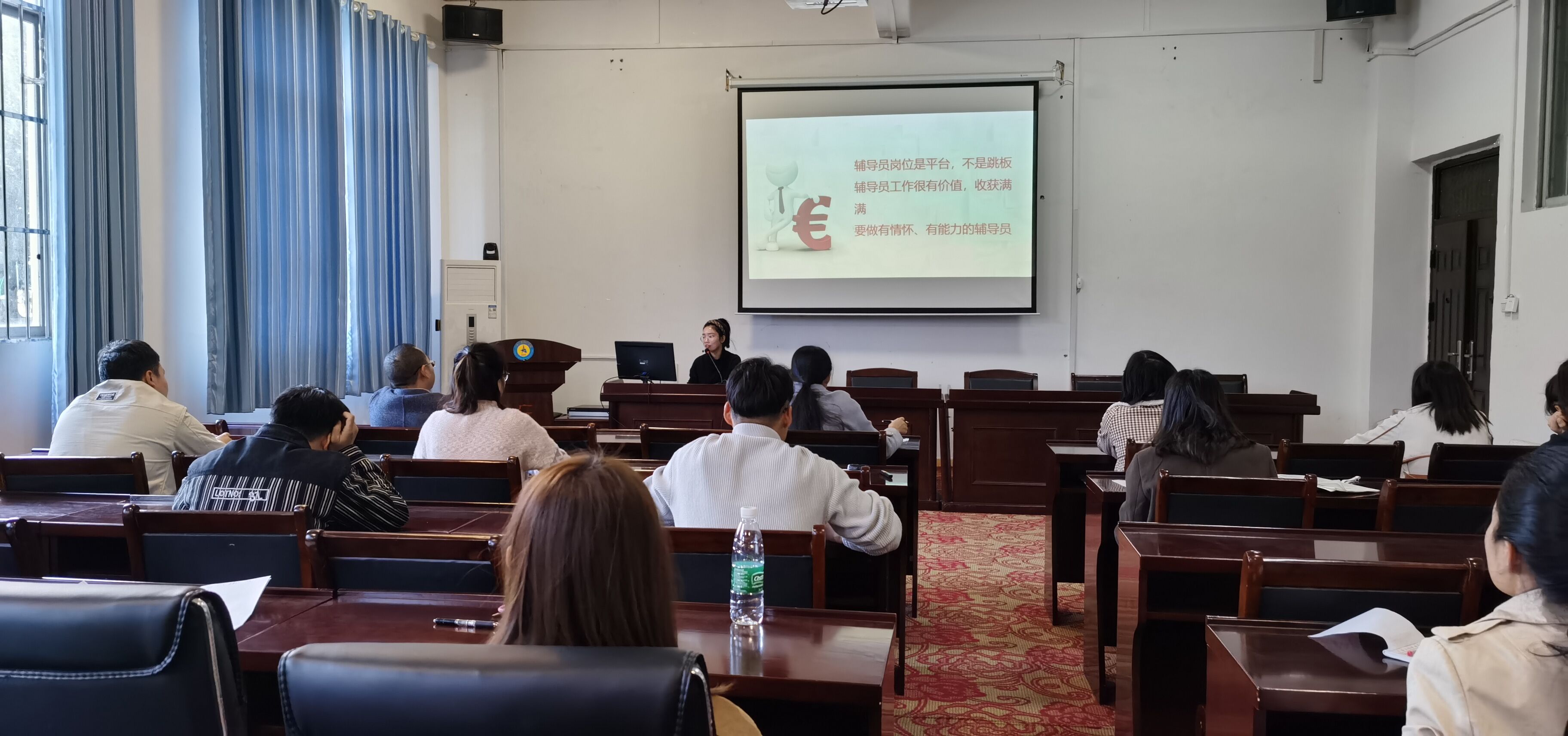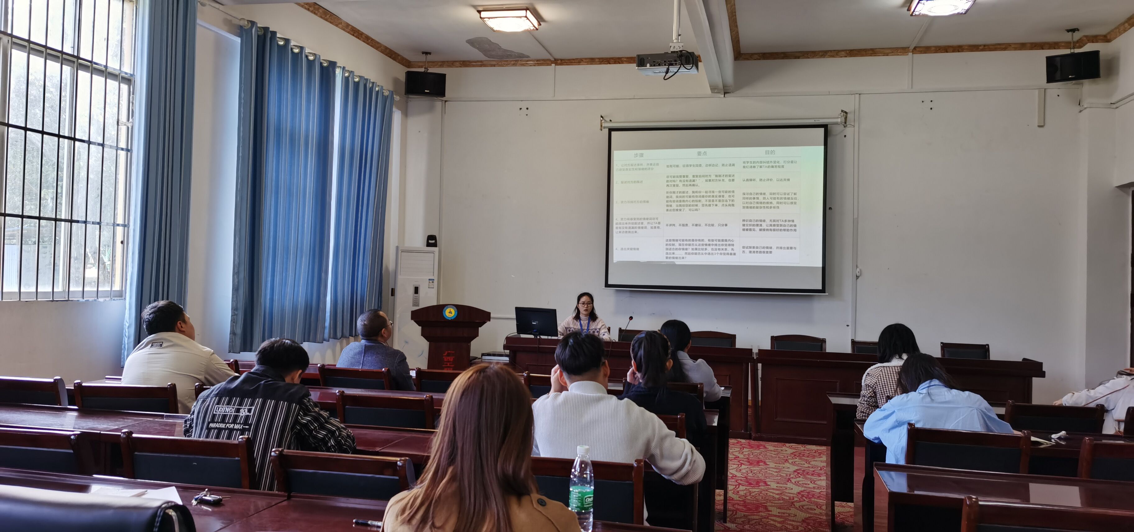 首先,由經(jīng)濟(jì)管理學(xué)院20級(jí)輔導(dǎo)員覃蘭蘭分享了自己參加2021年廣西高校輔導(dǎo)員骨干培訓(xùn)班的心得,她談到,在為期一周的培訓(xùn)中,通過(guò)聽(tīng)專題報(bào)告、參與案例分析、開(kāi)展攀巖活動(dòng)等形式,圍繞當(dāng)前高校學(xué)生工作中的難點(diǎn)、熱點(diǎn)問(wèn)題進(jìn)行了學(xué)習(xí)與探討,對(duì)高校輔導(dǎo)員工作有了進(jìn)一步的認(rèn)識(shí),深感輔導(dǎo)員工作的艱辛與責(zé)任,輔導(dǎo)員是學(xué)校與學(xué)生之間的媒介、紐帶、橋梁;是開(kāi)展學(xué)生思想政治教育的骨干力量;是學(xué)生健康成長(zhǎng)的指導(dǎo)者和引路人。所以說(shuō),輔導(dǎo)員工作是教育人、培養(yǎng)人的工作,而培養(yǎng)人、教育人的工作是有客觀規(guī)律的,這個(gè)規(guī)律是可認(rèn)知的,應(yīng)該遵循的。特別是對(duì)學(xué)生思想政治教育,心理健康教育以及法制觀念的教育,更有利于端正學(xué)生的學(xué)習(xí)態(tài)度,使他們的學(xué)習(xí)生活過(guò)得更加充實(shí),更加有意義。有利于避免一些本不應(yīng)該發(fā)生的惡性事件。她認(rèn)為,盡管輔導(dǎo)員日常工作的內(nèi)容比較雜,比較瑣碎。但作為一名教育工作者必須充分調(diào)動(dòng)自己工作熱情,積極融入到學(xué)生工作中,體現(xiàn)出自身的職業(yè)素養(yǎng),在學(xué)生心目中樹(shù)立良好的輔導(dǎo)員形象;充分發(fā)揮學(xué)生干部在學(xué)生工作中的積極作用,調(diào)動(dòng)他們的積極性,培養(yǎng)學(xué)生潛在能力。