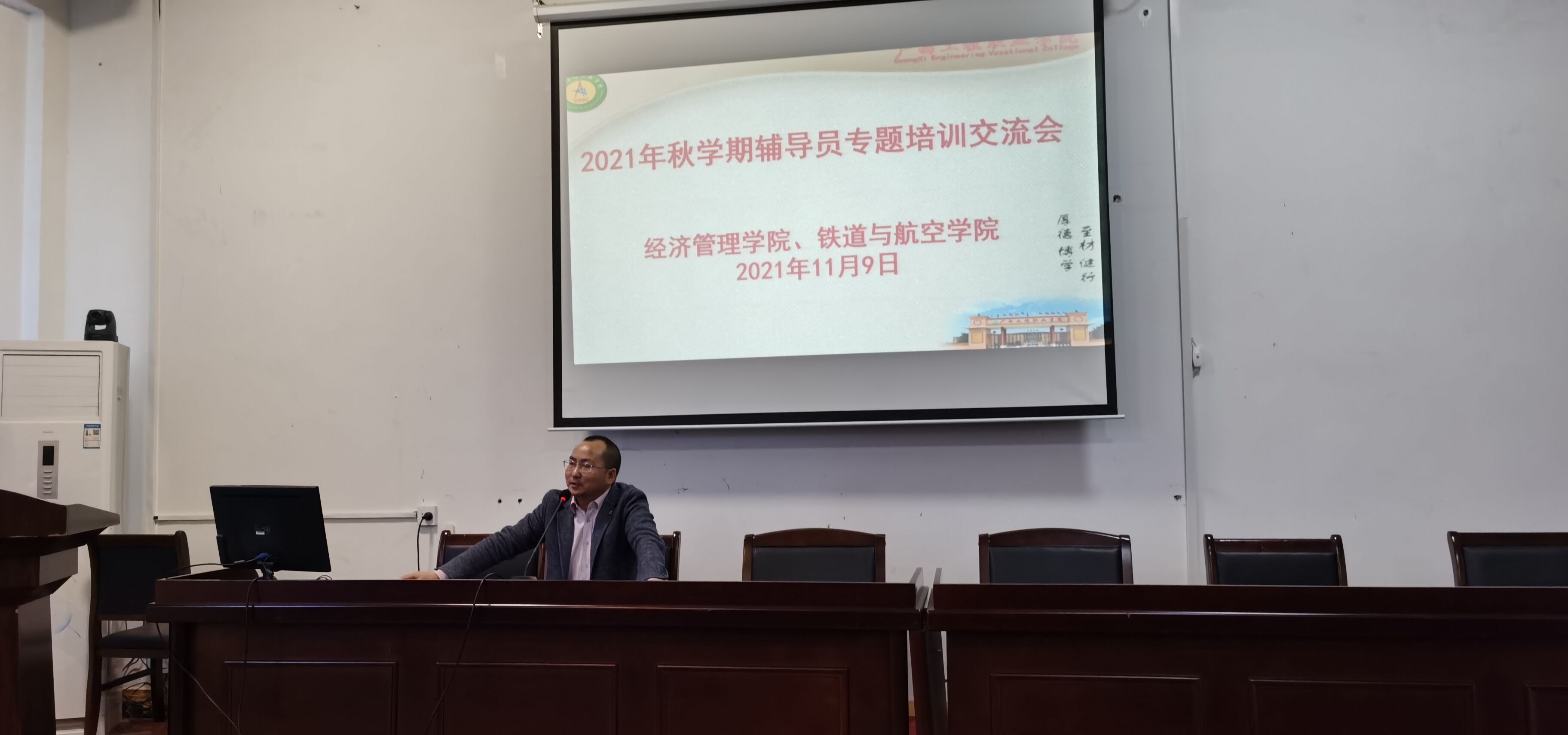 為提升我校思想政治工作質(zhì)量和輔導(dǎo)員隊(duì)伍建設(shè)水平,培養(yǎng)輔導(dǎo)員隊(duì)伍的職業(yè)榮譽(yù)感與歸屬感,增強(qiáng)輔導(dǎo)員的團(tuán)隊(duì)協(xié)作意識(shí),推動(dòng)輔導(dǎo)員隊(duì)伍專業(yè)化、職業(yè)化發(fā)展,11月9日下午,經(jīng)濟(jì)管理學(xué)院、鐵道與航空管理學(xué)院在我校圖書(shū)館一樓學(xué)術(shù)報(bào)告廳聯(lián)合召開(kāi)2021年秋學(xué)期輔導(dǎo)員專題培訓(xùn)交流會(huì),學(xué)校黨委委員、副校長(zhǎng)彭高彬參與并指導(dǎo)此次交流會(huì),兩個(gè)二級(jí)學(xué)院的黨支部書(shū)記、分團(tuán)委書(shū)記、全體輔導(dǎo)員參加交流會(huì)。