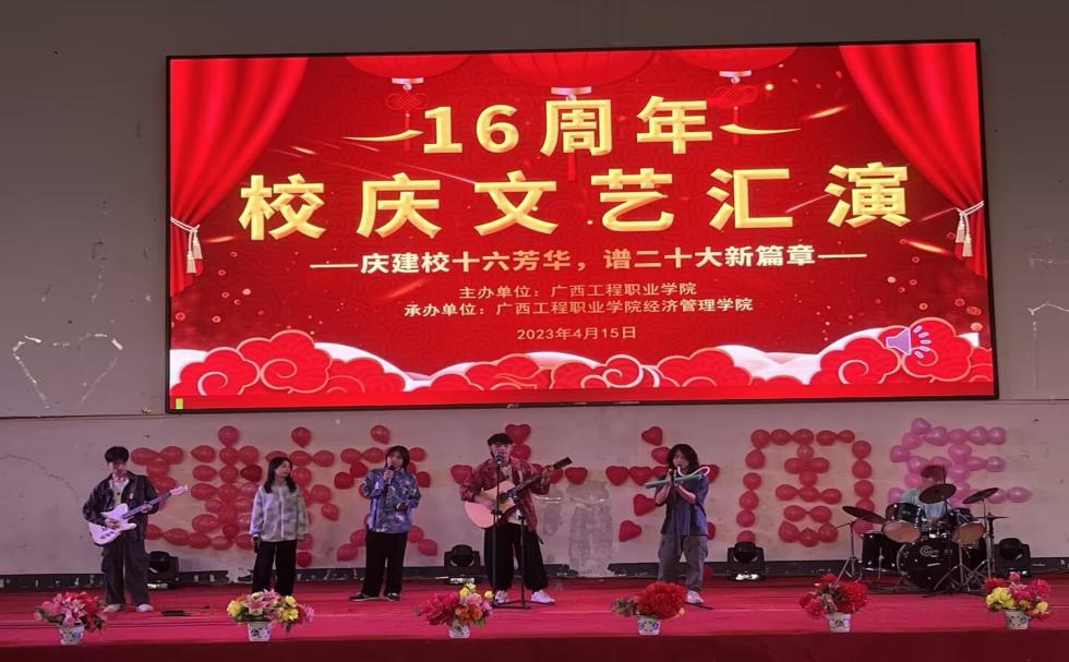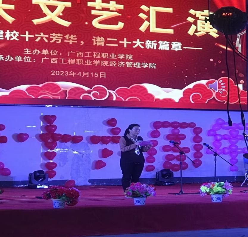 奏唱國(guó)歌完畢,由經(jīng)濟(jì)管理學(xué)院黨支部書記 院長(zhǎng)-致辭,慶祝建校十六周年。最后由經(jīng)濟(jì)管理學(xué)院黨支部副書記-宣布晚會(huì)開始。