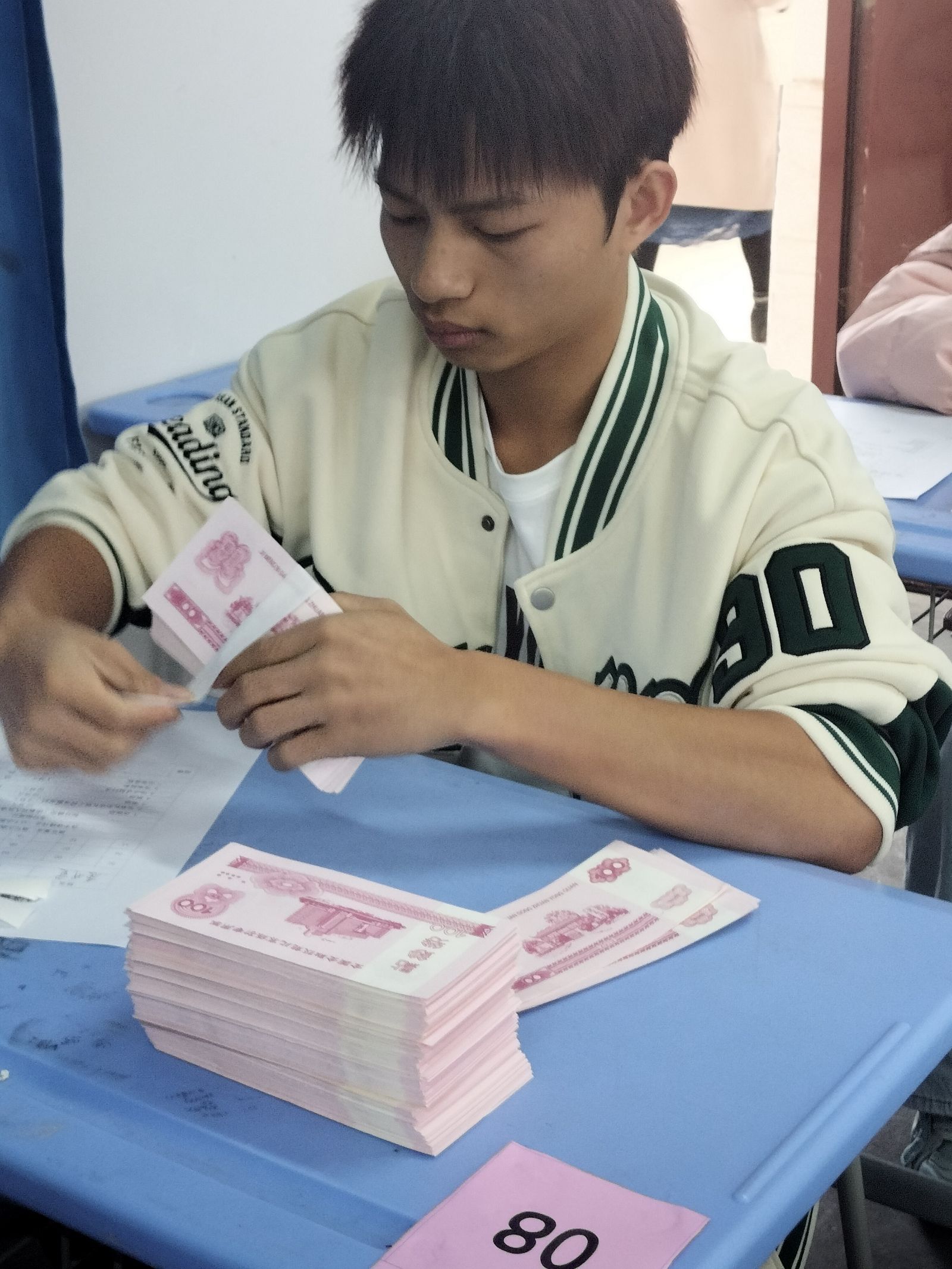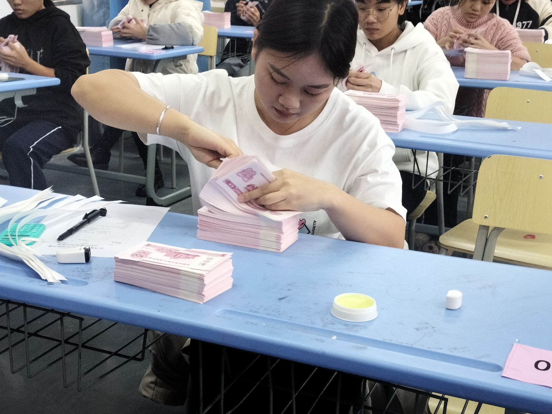 點鈔比賽項目中選手們通過撥、滑、挑、摞,電光火石間數(shù)十張點鈔券于指尖滑落,手指對鈔券的攻勢愈發(fā)猛烈,有三指劃出,有五指并用,也有二指游溯,空氣在這一刻似乎都凝固了。同學們于指尖和鈔券間點燃激情,競攀速度之巔。