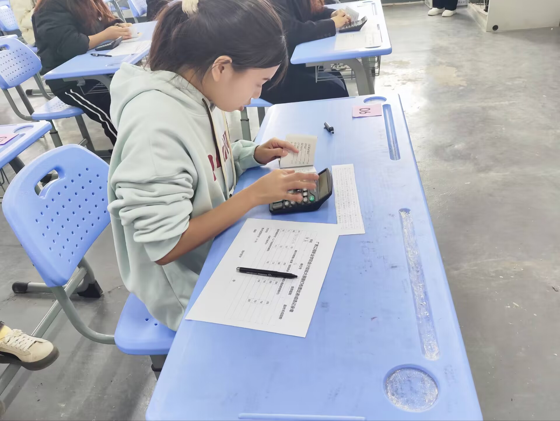 翻打傳票項目中,隨著老師“開始”一聲令下,選手們迅速進入比賽狀態(tài),每位選手都全神貫注地投入比賽當中,目光在傳票和計算器上的數(shù)字之間來回掃視,左手嫻熟地翻動著傳票,右手快速地敲擊著鍵盤上的按鍵,手指快捷、輕靈地游走在各個數(shù)字和符號之間,沒有片刻中斷。比賽現(xiàn)場呈現(xiàn)出職業(yè)競技中專業(yè)而緊張的氛圍。敏捷的反應與熟練的指法,展現(xiàn)出財會學子對職業(yè)技能日益駕輕就熟、嚴謹認真的職業(yè)態(tài)度。