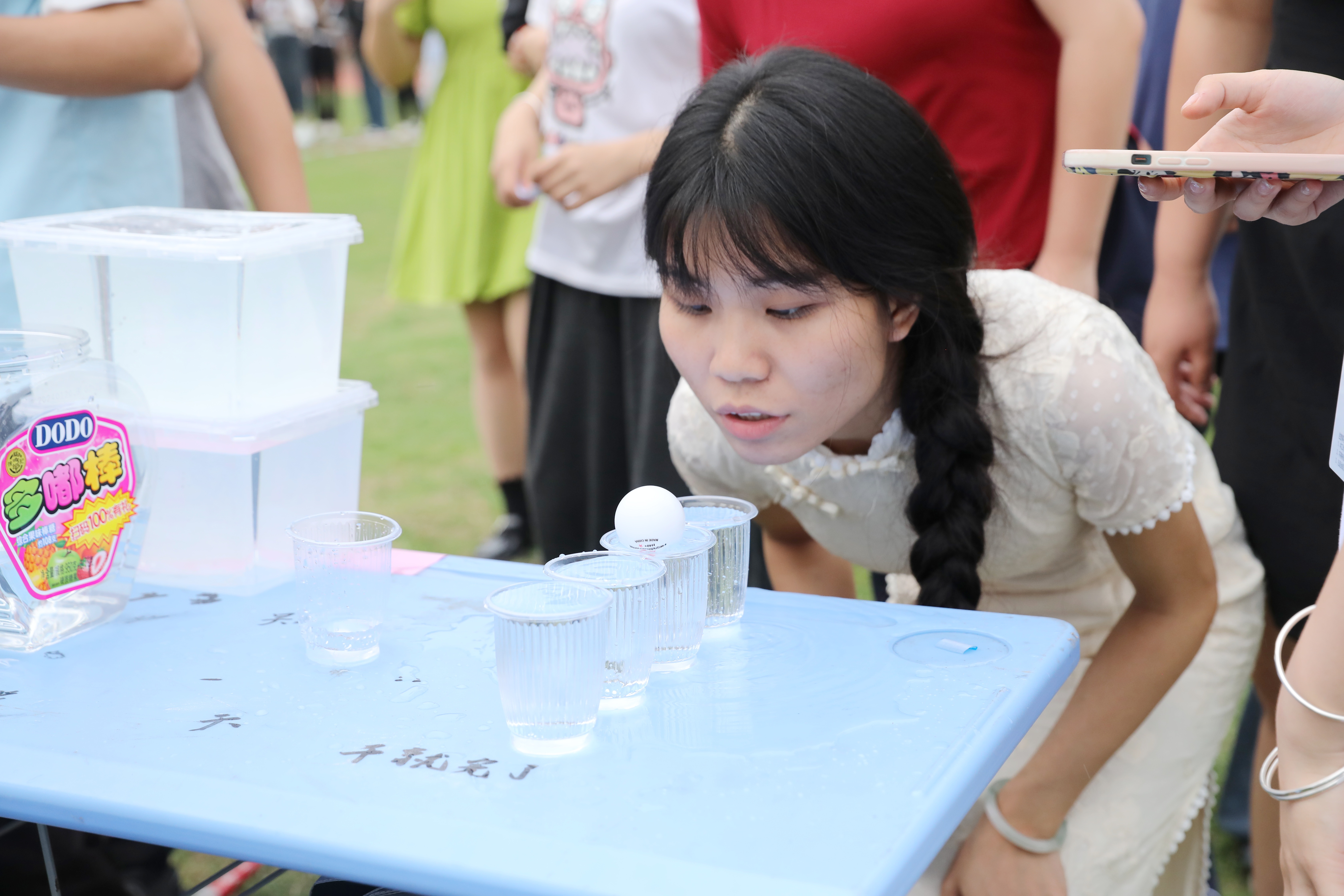 項目二:漂洋過海,4杯水并排一列,將乒乓球從第一杯吹到第4杯,完成時間最短即可獲得獎品。
