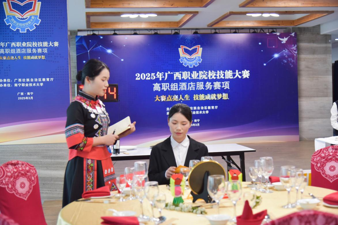 2025年廣西職業(yè)院校技能大賽(高職組)《酒店服務(wù)》賽項(xiàng)于3月14日至16日在南寧職業(yè)技術(shù)大學(xué)舉行,各校代表隊(duì)共23個(gè)。彭麗文、謝錫潔、盧桂玉老師指導(dǎo)23級(jí)酒店管理與數(shù)字化運(yùn)營(yíng)專業(yè)劉春雨、謝詩(shī)蕊、李雨珍3名同學(xué)參加了此次比賽。通過(guò)本項(xiàng)目競(jìng)賽,使得學(xué)生能熟練掌握酒店前廳客房預(yù)訂、入住辦理流程、中餐主題宴會(huì)設(shè)計(jì)及宴會(huì)酒水服務(wù)、中餐點(diǎn)餐服務(wù)、中餐上菜服務(wù)、西餐廳酒水服務(wù)、西餐點(diǎn)餐服務(wù)、西餐上菜服務(wù)、酒店服務(wù)專業(yè)英語(yǔ)口語(yǔ)交流等業(yè)務(wù)技能,實(shí)現(xiàn)對(duì)學(xué)生團(tuán)隊(duì)協(xié)同創(chuàng)新能力、溝通能力、專業(yè)技能水平及專業(yè)崗位能力的綜合素質(zhì)檢驗(yàn)。
