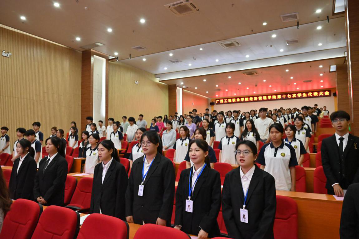 大會(huì)在莊嚴(yán)的國歌聲中拉開帷幕,激昂的旋律傳遞著經(jīng)管學(xué)子的使命擔(dān)當(dāng)。經(jīng)濟(jì)管理學(xué)院黨支部書記、院長覃清香、經(jīng)濟(jì)管理學(xué)院分團(tuán)委書記謝彩英以及學(xué)院全體輔導(dǎo)員出席大會(huì),學(xué)院各班級(jí)共130名學(xué)生代表參加大會(huì)。大會(huì)由經(jīng)濟(jì)管理學(xué)院分團(tuán)委書記謝彩英主持。