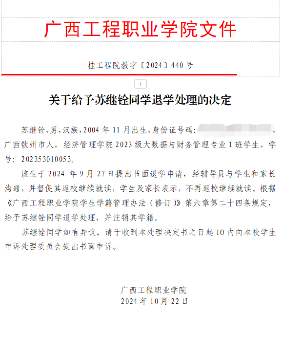 根據(jù)《普通高等學(xué)校學(xué)生管理規(guī)定》(教育部令第41號)、《廣西工程職業(yè)學(xué)院學(xué)生學(xué)籍管理辦法(修訂)》第二十四條規(guī)定,給予蘇繼銓同學(xué)退學(xué)處理,并注銷其學(xué)籍。
