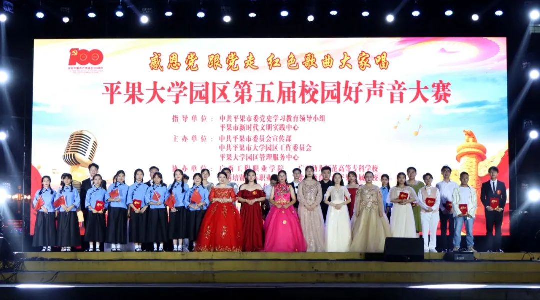 百年征程波瀾壯闊,百首紅歌頌贊初心。為推動(dòng)黨史學(xué)習(xí)教育走深走實(shí),以優(yōu)異成績獻(xiàn)禮黨的百年華誕,2021年6月18日,平果市“感黨恩跟黨走紅色歌曲大家唱——平果大學(xué)園區(qū)第五屆校園好聲音大賽”決賽在平果市文化公園舉行,我校師生積極參加,并取得銀獎(jiǎng)2項(xiàng)、銅獎(jiǎng)1項(xiàng)、優(yōu)勝獎(jiǎng)1項(xiàng)的好成績。