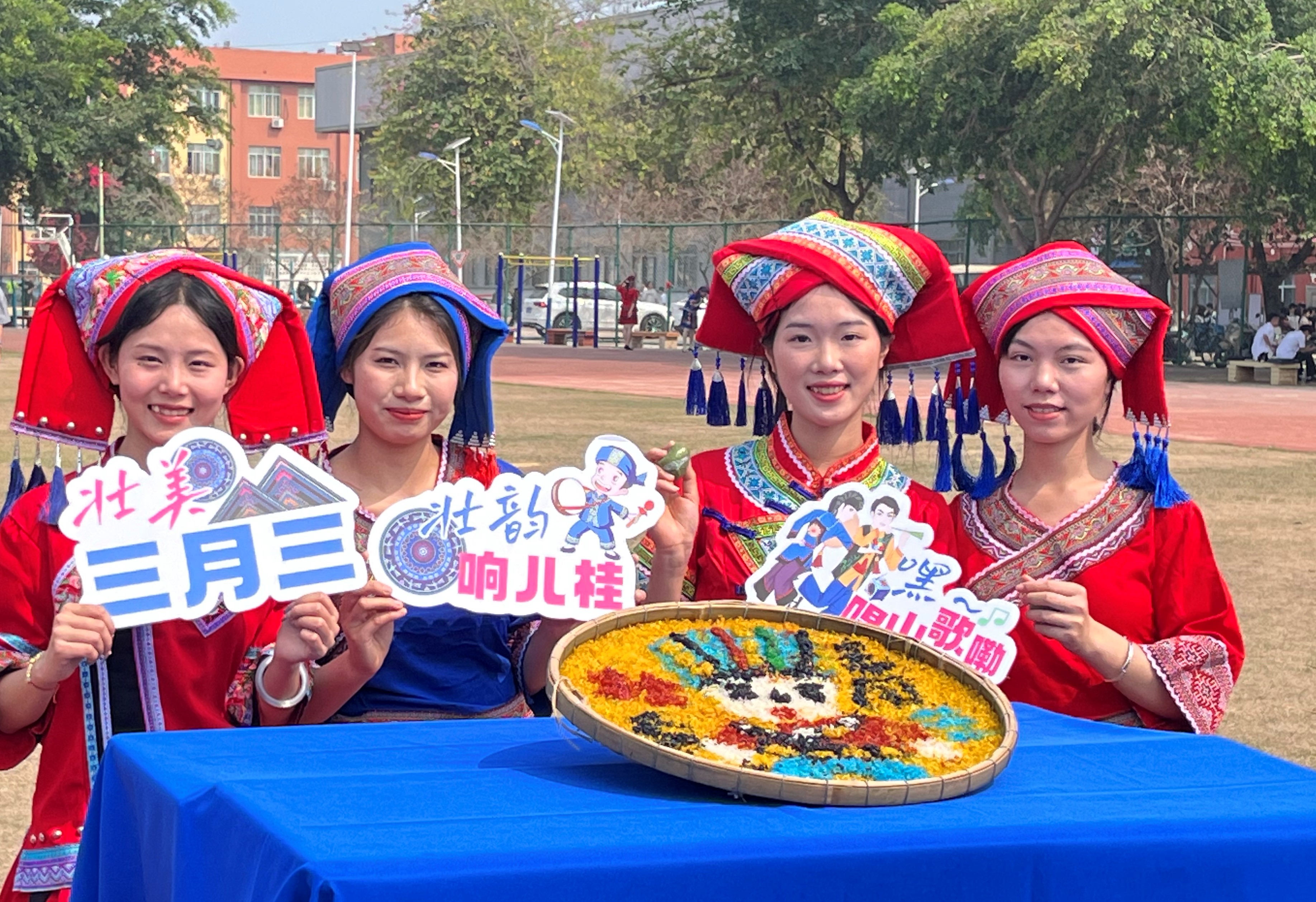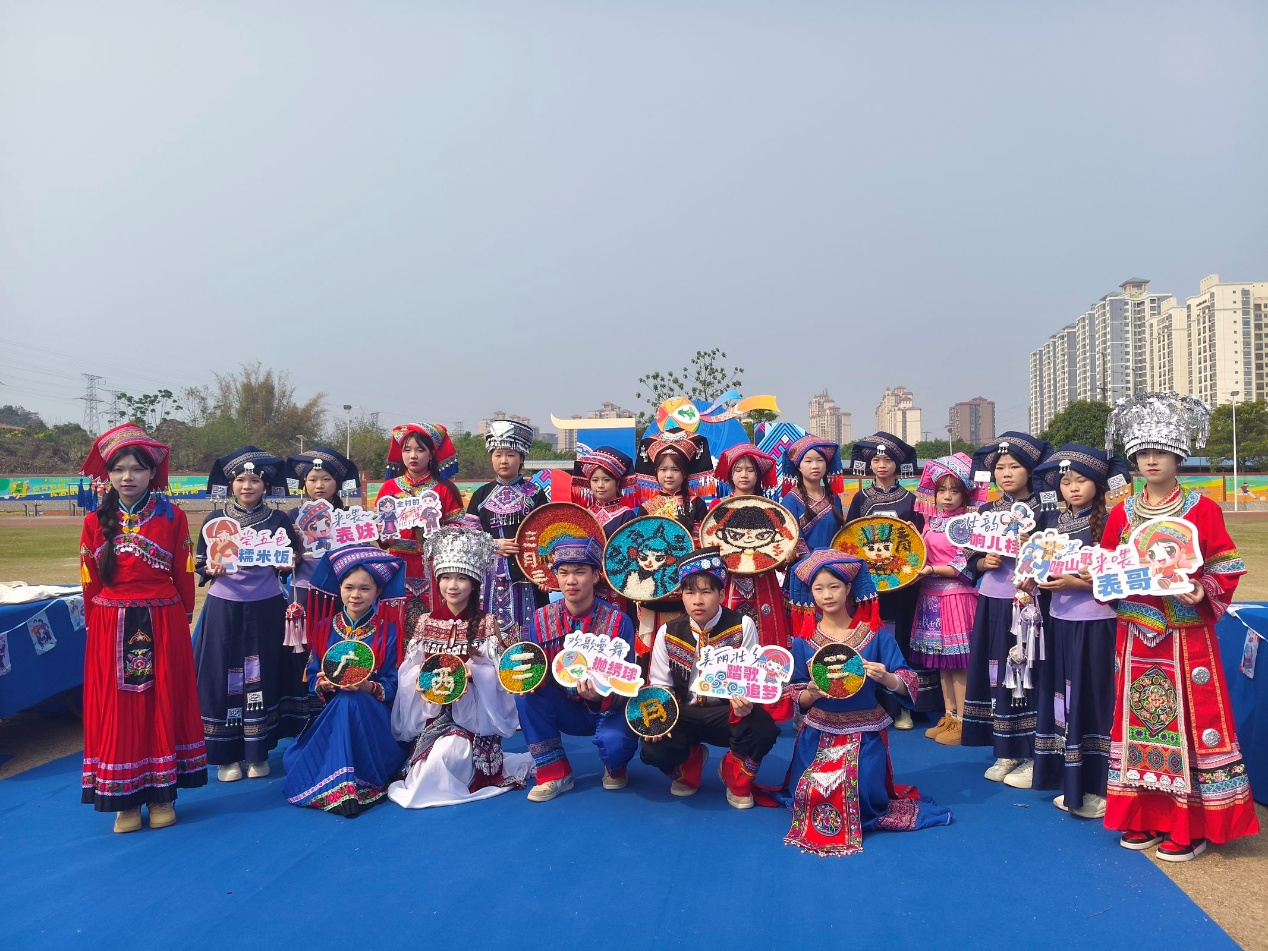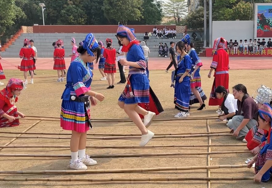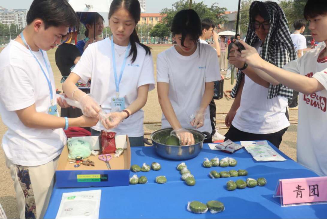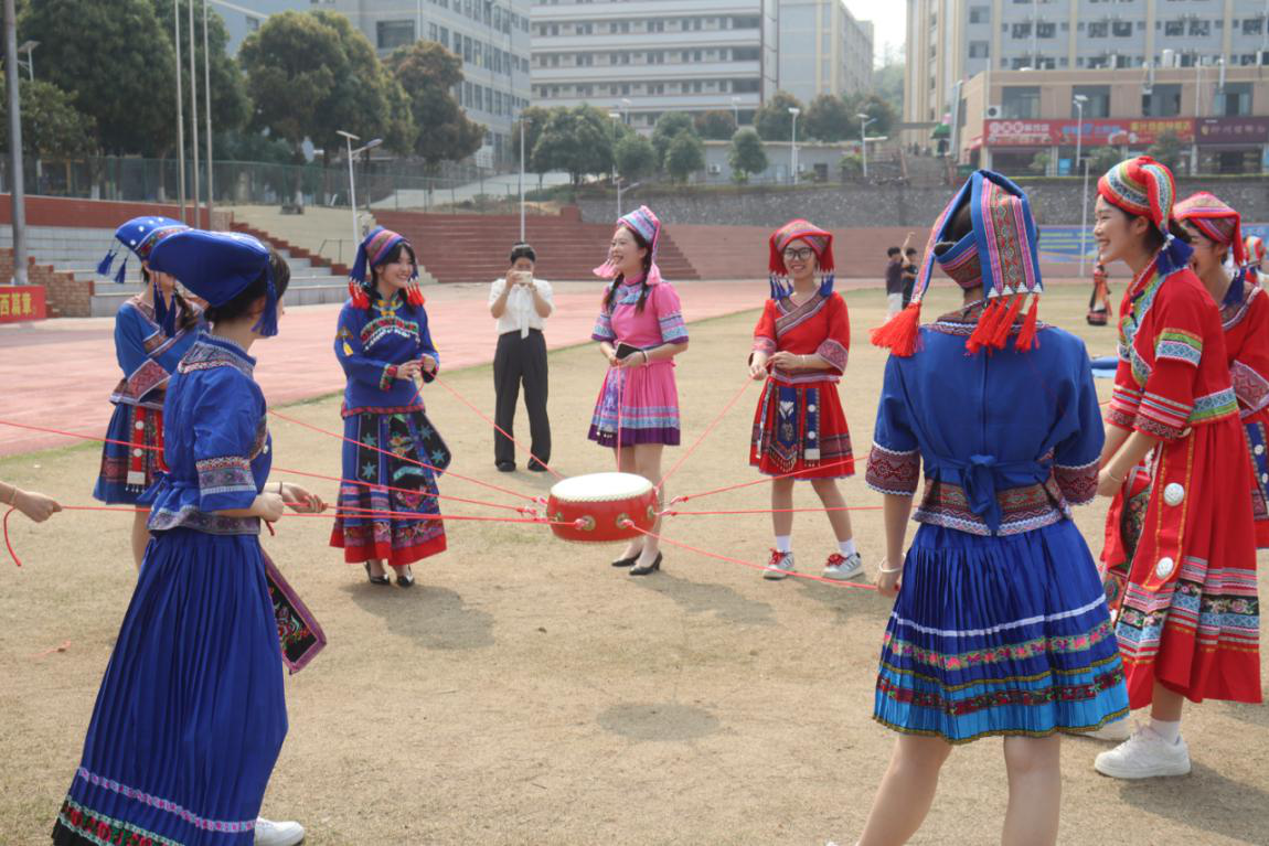 其中在民族手工藝展示區(qū),師生親手制作壯鄉(xiāng)手工銅鼓、編織民族飾品,感受工藝術(shù)的樂趣;在民族美食區(qū),大家一起動(dòng)手制作并品嘗到地道的壯族美食,如五色糯米飯、青團(tuán)等,讓味蕾也沉浸在民族文化的海洋中;在民族體育競技區(qū),師生共同參與同心擊鼓、拋繡球等傳統(tǒng)體育項(xiàng)目,感受民族體育的激情與活力。