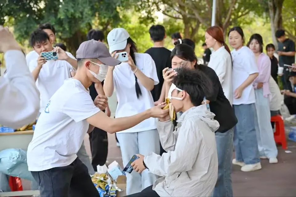 除了激烈的競技比賽,活動現(xiàn)場還設(shè)置了多個趣味小游戲,如套圈活動、蒙眼吃香蕉、徒手穿花褲等。在套圈活動中,師生們站在指定線外,對準目標扔出圈圈,套中物體即為成功。蒙眼吃香蕉則考驗了兩人之間的默契,一人蒙眼,一人指揮,將香蕉喂到同伴口中。徒手穿花褲更是吸引了眾多觀眾的目光,參賽人員在指定區(qū)域快速穿上特制花褲,完成規(guī)定動作,現(xiàn)場笑聲不斷。