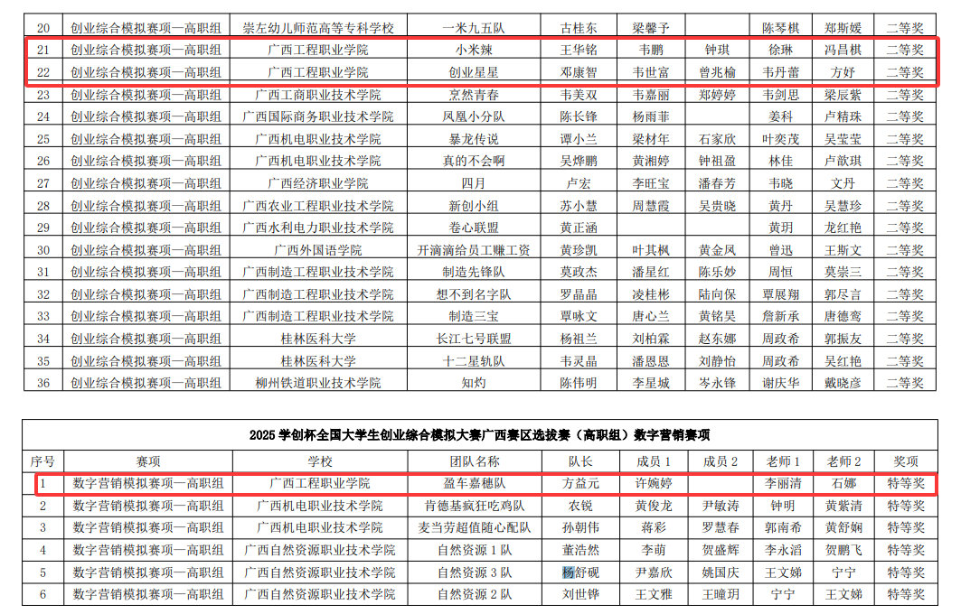 6月27日—28日,2025年第十二屆“學(xué)創(chuàng)杯”全國(guó)大學(xué)生創(chuàng)業(yè)綜合模擬大賽廣西賽區(qū)選拔賽(職教組)在柳州職業(yè)技術(shù)大學(xué)舉行,本次選拔賽(職教組)共有32所高校、500余師生參與競(jìng)賽。我院徐琳、韋丹蕾兩位老師帶領(lǐng)2023級(jí)城市軌道交通工程技術(shù)專業(yè)方益元等同學(xué)參加了此次比賽,榮獲特等獎(jiǎng)1項(xiàng)、一等獎(jiǎng)1項(xiàng)、二等獎(jiǎng)1項(xiàng)!